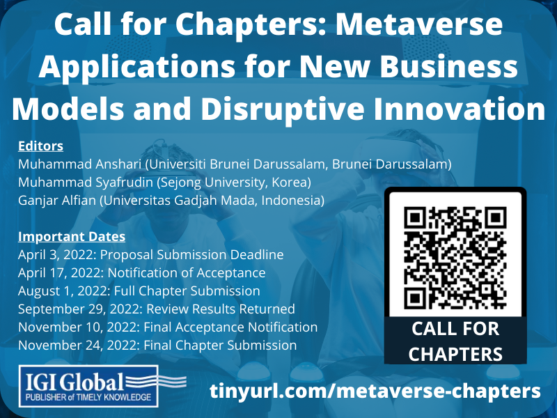 Currently, we are in the process of editing a forthcoming book entitled "Metaverse Applications for New Business Models and Disruptive Innovation", to be published by IGI Global, an international publisher of progressive academic research.